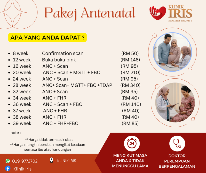 Pemantauan kesihatan ibu dan kandungan sepanjang tempoh kehamilan bagi memastikan perkembangan bayi berjalan dengan baik.